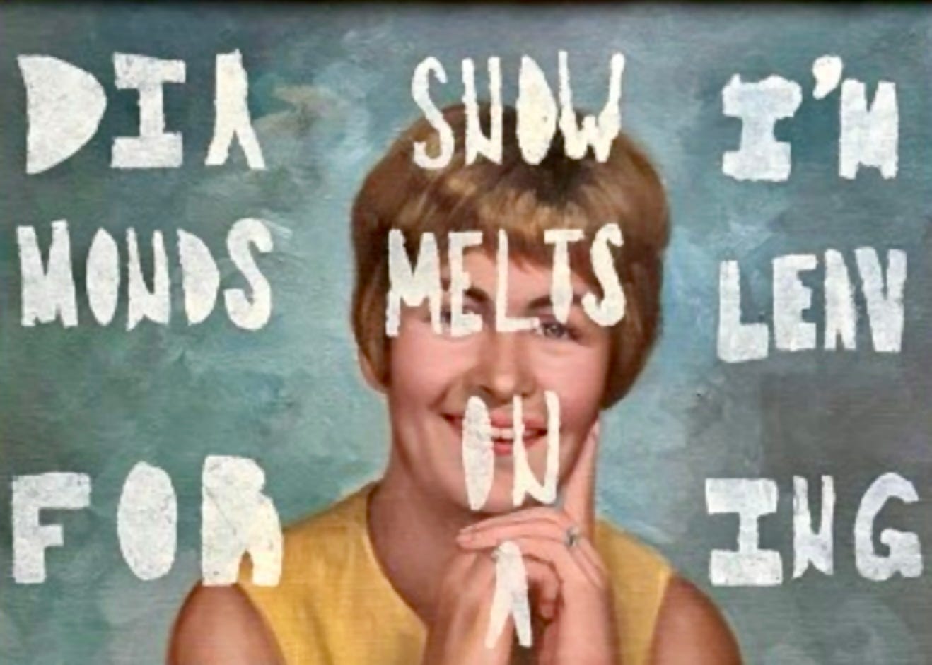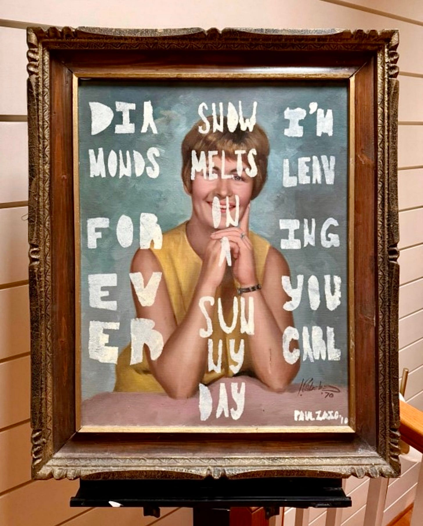 One day, at the thrift store, I came across an oil painting. It was a portrait of a blond woman in a yellow dress with Carol Brady hair. She was resting her chin on her hands. She had a diamond ring. She was smiling. It seemed to me that she had a secret.