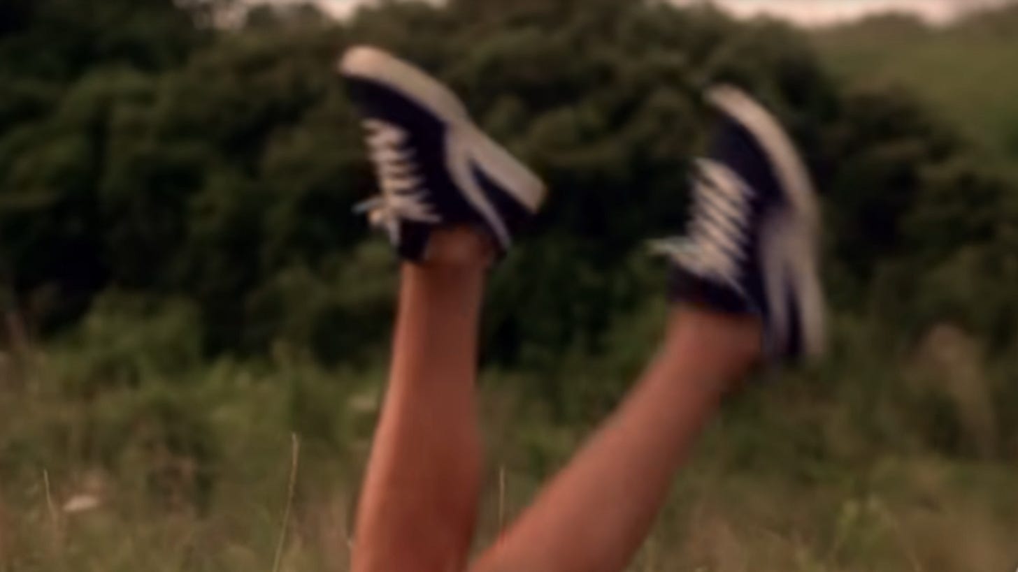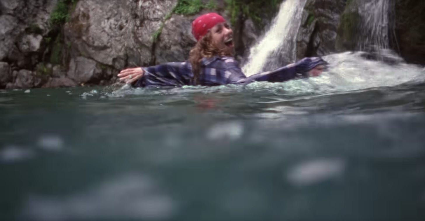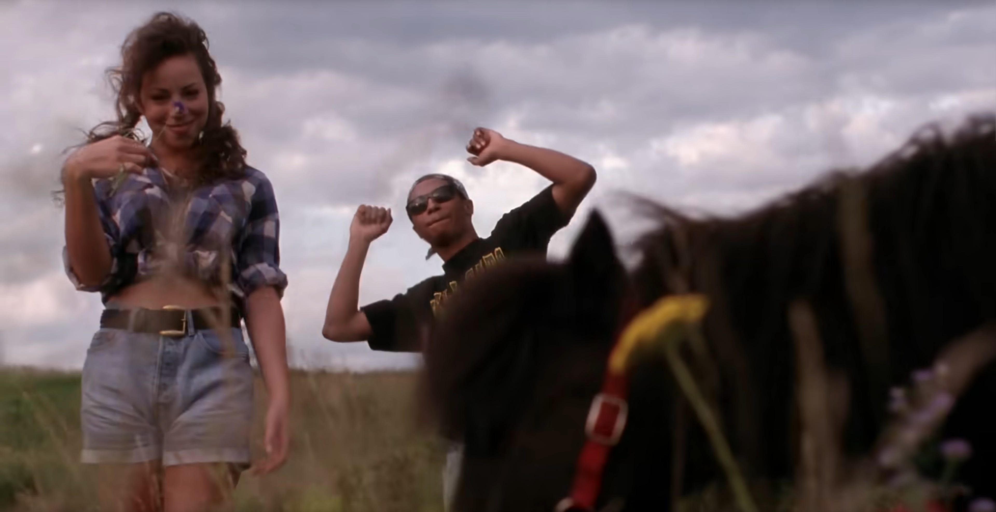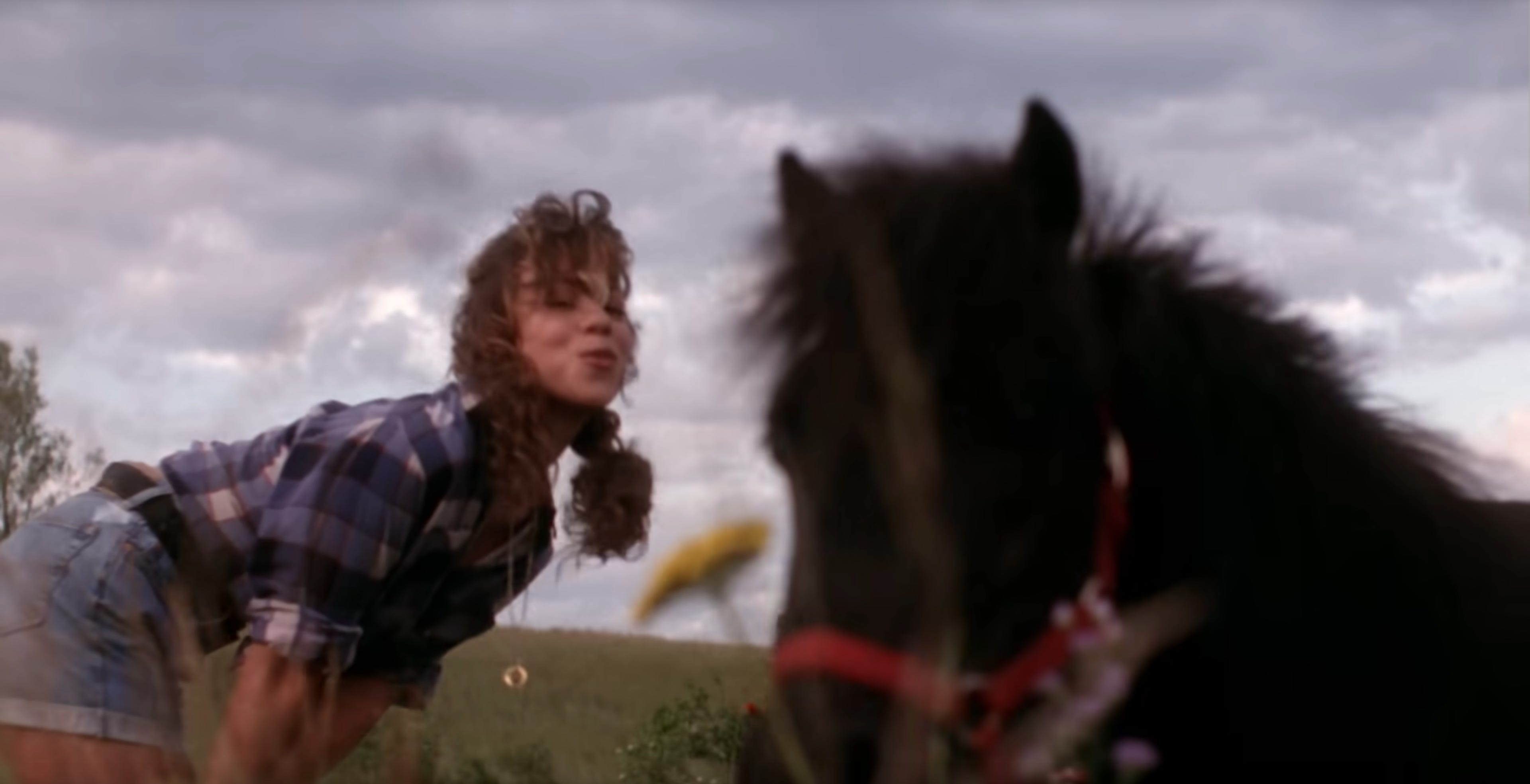 Anyway, we don’t get to see ourselves surface—not right away. Suddenly, we’re in a wide-open field. There are grassy hills as far as the eye can see. We’re wearing, potentially, the same jean shorts that we were wearing under the water, but now we’ve accessorized them with a chunky black belt. Now we’re wearing a flannel shirt with the sleeves rolled up. Like the underwater gingham shirt that came before her, the flannel shirt is also cinched just below our bust-line. In our memory, it was purple and white. In 4k, it seems pretty clear that it’s blue and white with little red stripes, and so it probably just read as purple and white on our little CRT TV when we were ten years old.