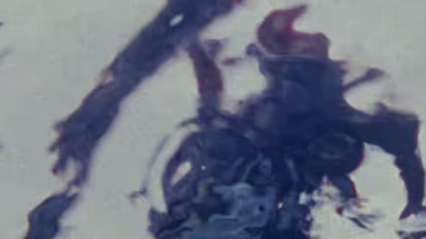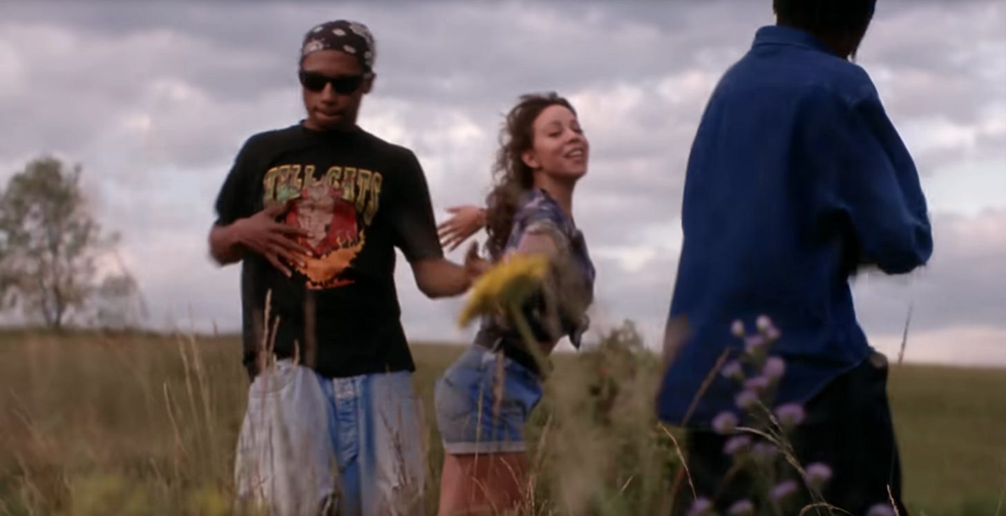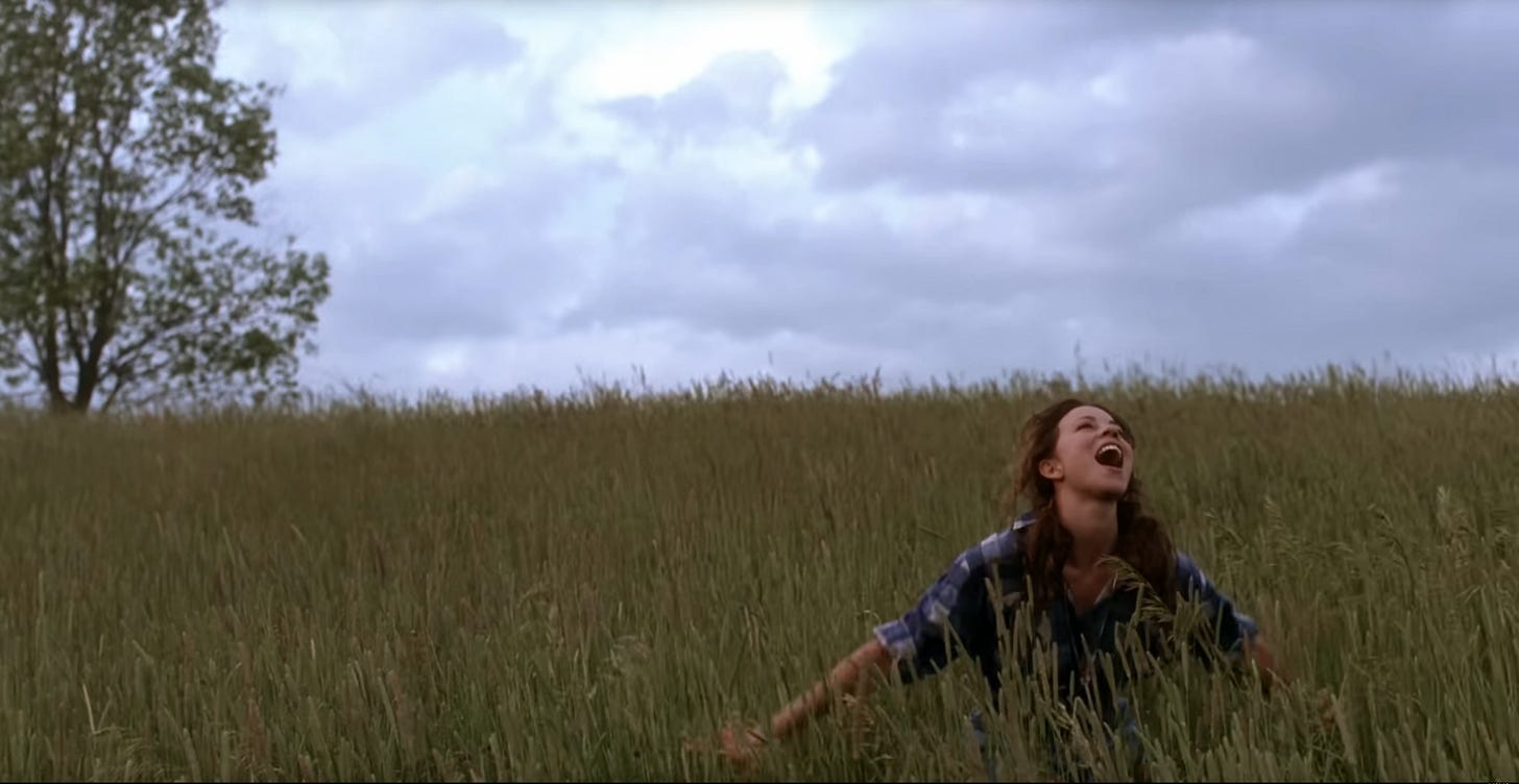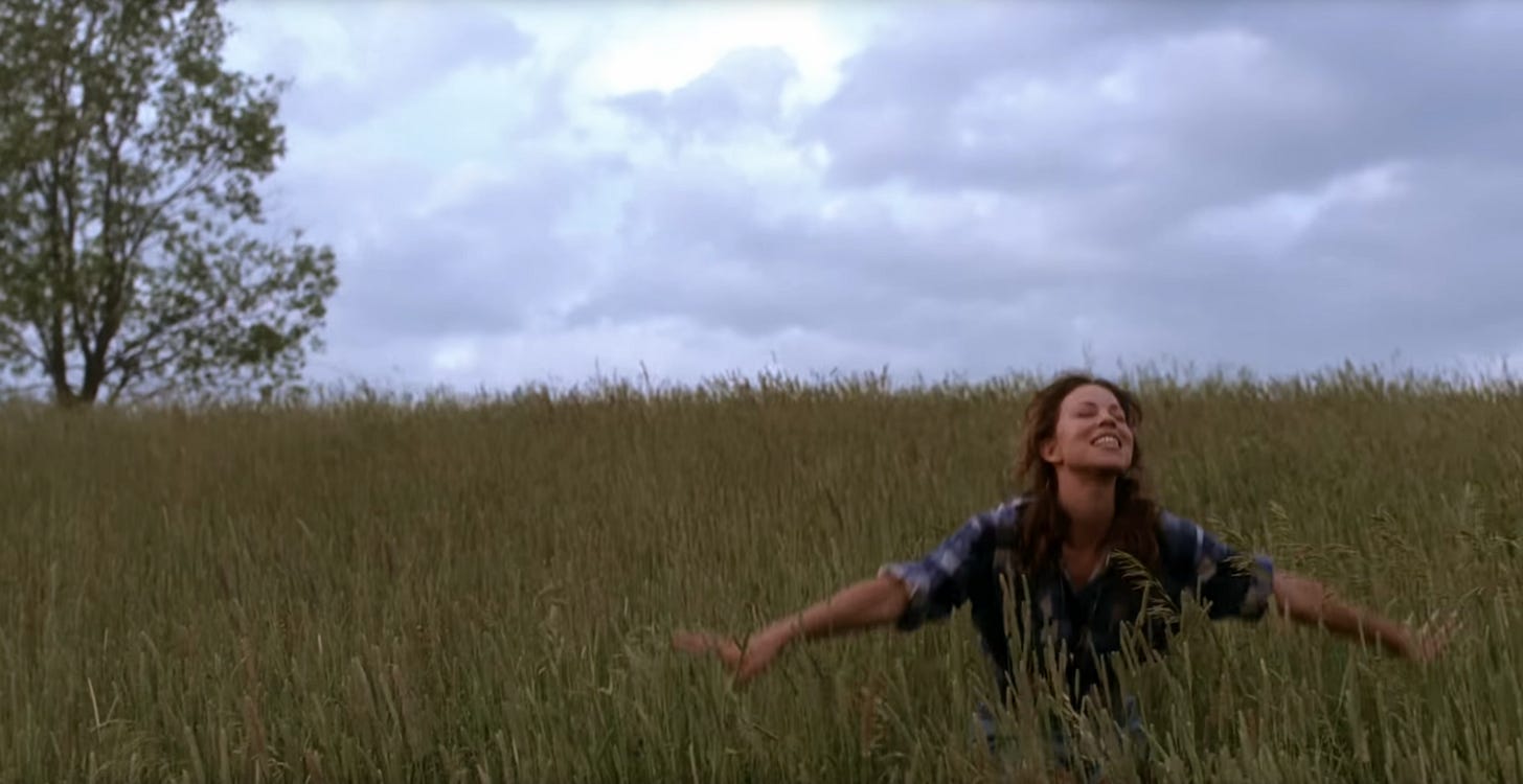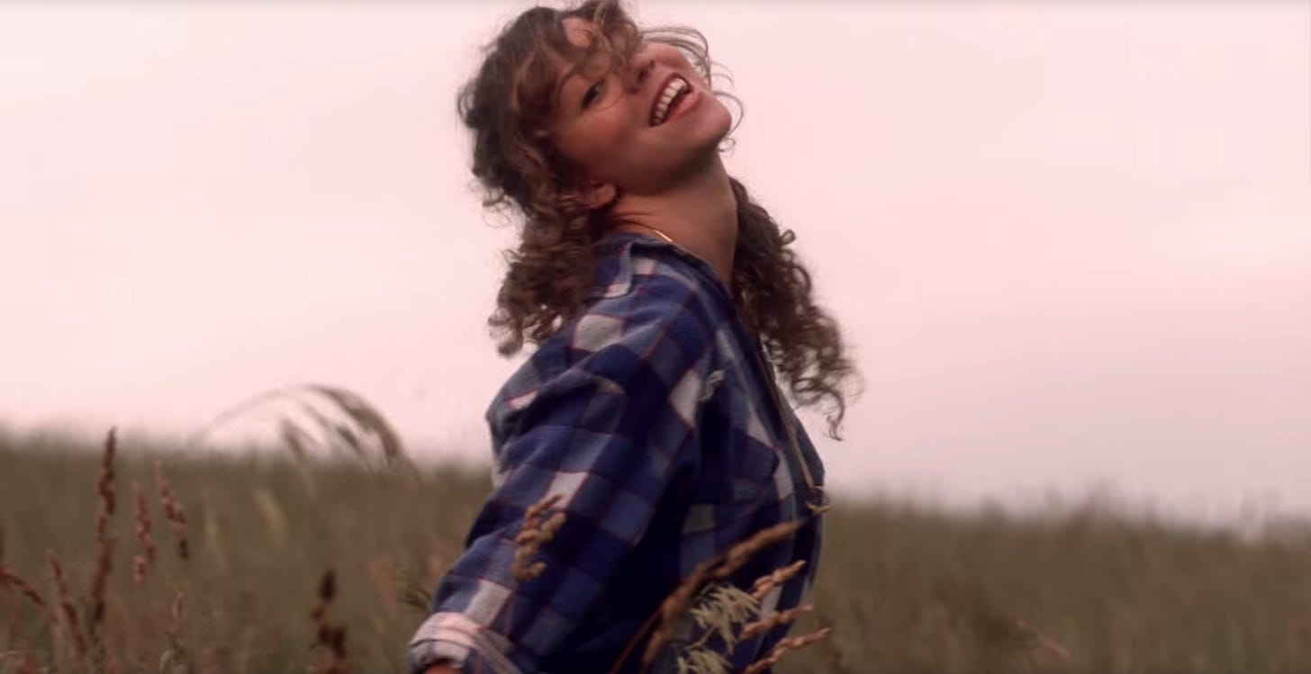 Anyway, we don’t get to see ourselves surface—not right away. Suddenly, we’re in a wide-open field. There are grassy hills as far as the eye can see. We’re wearing, potentially, the same jean shorts that we were wearing under the water, but now we’ve accessorized them with a chunky black belt. Now we’re wearing a flannel shirt with the sleeves rolled up. Like the underwater gingham shirt that came before her, the flannel shirt is also cinched just below our bust-line. In our memory, it was purple and white. In 4k, it seems pretty clear that it’s blue and white with little red stripes, and so it probably just read as purple and white on our little CRT TV when we were ten years old.