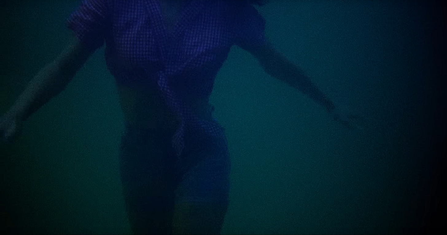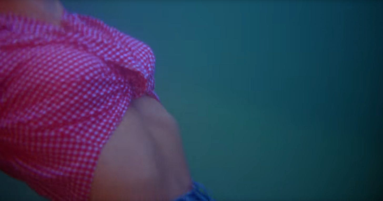 Suddenly we’re having an out of body experience, watching ourselves swim up to the surface. We’re wearing jean shorts and a short-sleeved red gingham shirt, cinched just below our bust-line so that… our tummy doesn’t get too warm? Under the water?