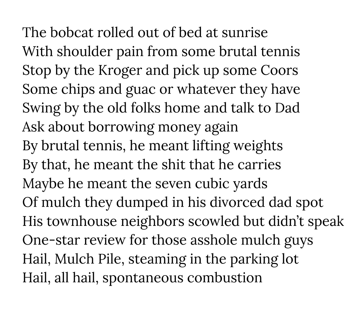 Poem: One-star reviewIn which a mulch pilePaul ZaicMay 15, 20251ShareOne-star reviewLeave a commentThanks for reading If This Is an Emergency! Subscribe for free to receive new posts and support my work.Subscribe