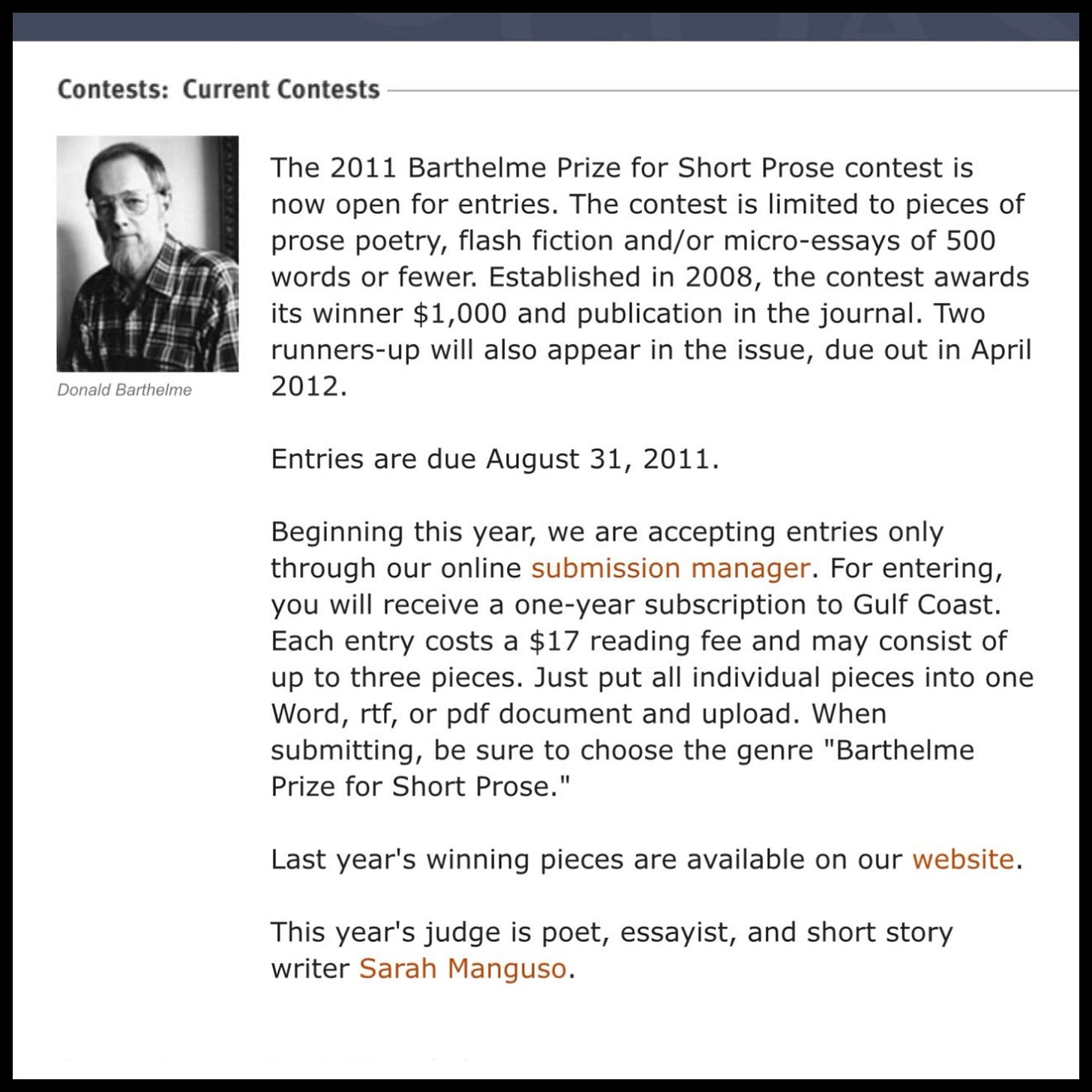 So, as one does, I submitted a prose poem to the 2011 Barthelme Prize for Short Prose. The contest is still held annually by Gulf Coast.