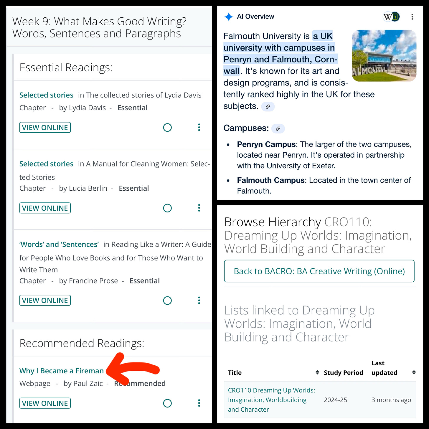 I kept scrolling through the search results, and wouldn’t you know it, “Why I Became a Fireman” is on a reading list for an online creative writing course that is being taught as we speak in the year of our Lord 2025. Via Falmouth University! Which is in the UK! Apparently!